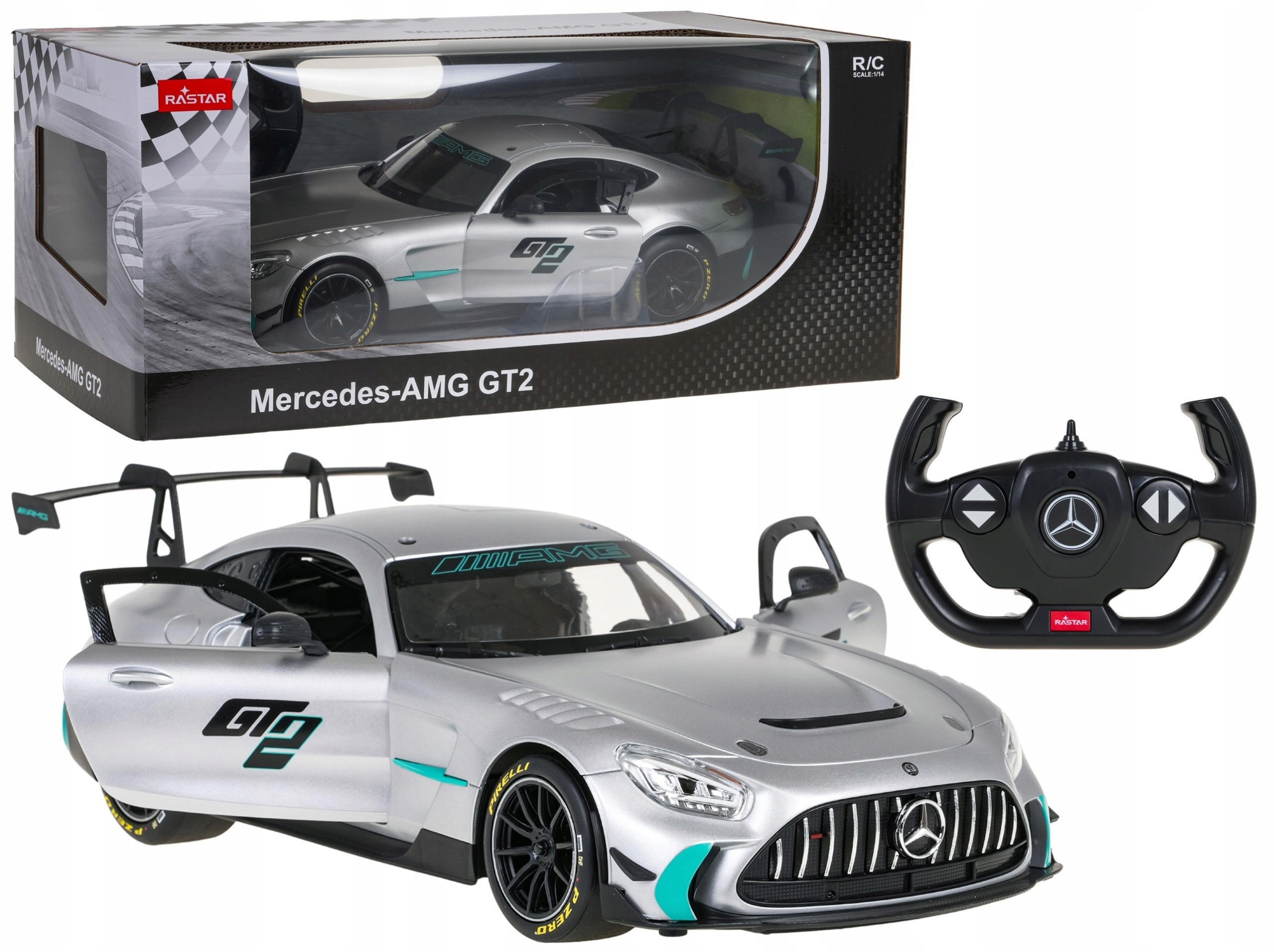 سيارة ريموت كنترول مرخّصة 1:14 Mercedes‑AMG GT2 بتصميم مستوحى من سيارات السباق، توجيه دقيق ومصابيح أمامية LED عاملة لقيادة واقعية ومظهر جامعي.