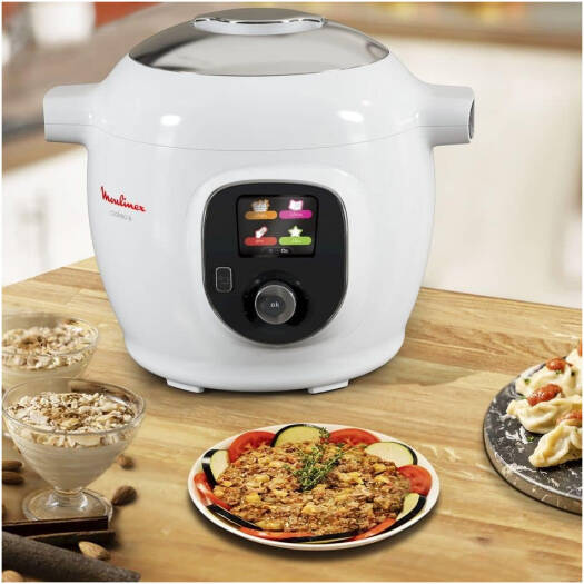 جهاز مولينكس Cookeo+ CE851127 متعدد الوظائف بسعة 6 لتر للطهي الذكي. يتميز بـ 6 أوضاع للطهي (بما في ذلك الطهي تحت الضغط، البخار، التحميص، الطهي البطيء وإعادة التسخين)، أكثر من 100 وصفة مبرمجة بخيارات تعليمات خطوة بخطوة