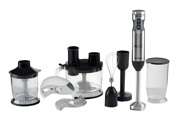 A multifunctional hand blender with attachments for 7 essential kitchen functions: Blending, whisking, potato mashing, chopping, grating, shredding, and slicing. It comes with a 2-liter food processor that is a powerful helper to prepare a wide range of recipes with ease and efficiency.