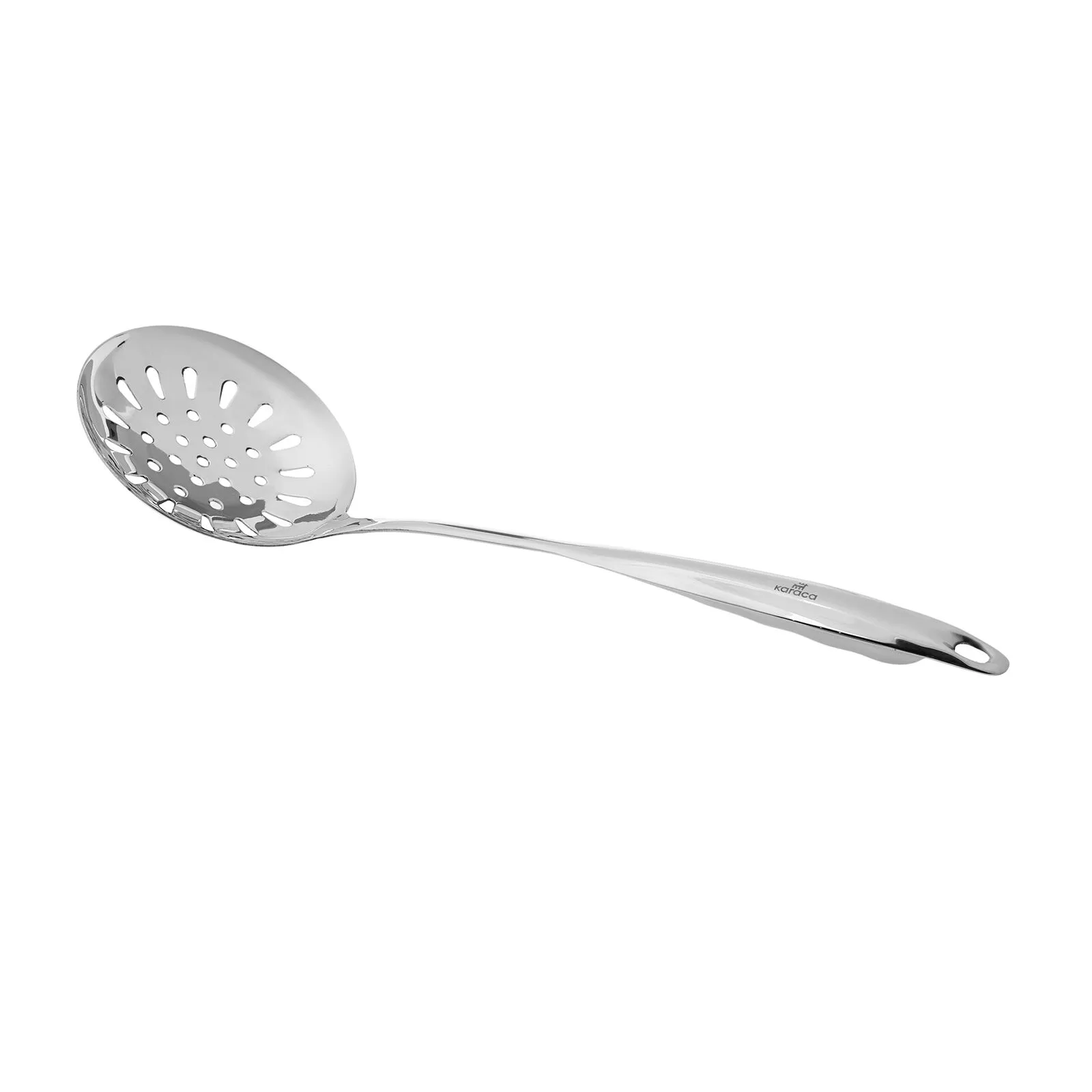 The 37cm Karaca Kefjir Luxury Strainer is an essential tool in the kitchen, helping to easily remove foods from liquids or oils while cooking. The perforated design allows liquids to drain quickly, making it ideal for stir-fries, vegetables, pasta or boiled foods. Made of high-quality stainless steel for durability and rust resistance with an ergonomic handle for better control during use.