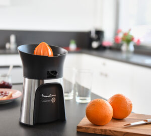 Citrus Juicer Direct Surf with metal casing and distinctive design and finish. The new VitaPress Direct Serve is wrapped in a metal sleeve and has a distinctive design and finish. It features a convenient recessed space for glasses, anti-drip function, lid protector and cord storage.