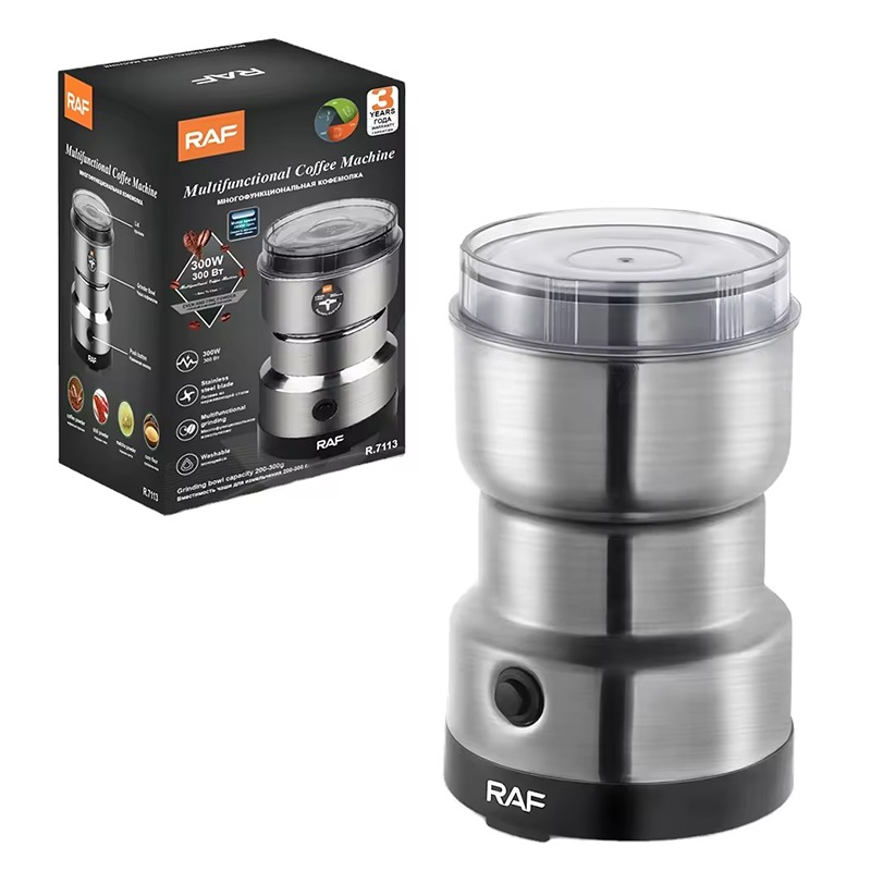 The RAF R.7113 is a versatile kitchen appliance used for grinding dry items such as coffee, spices, grains and nuts. It features a powerful motor and sharp stainless steel blades, giving it the ability to grind quickly and uniformly. Its compact design makes it easy to store, and the grinding bowl is made of easy-to-clean materials. It is recommended to use it only for dry materials and avoid prolonged continuous operation in order to preserve the life of the motor.