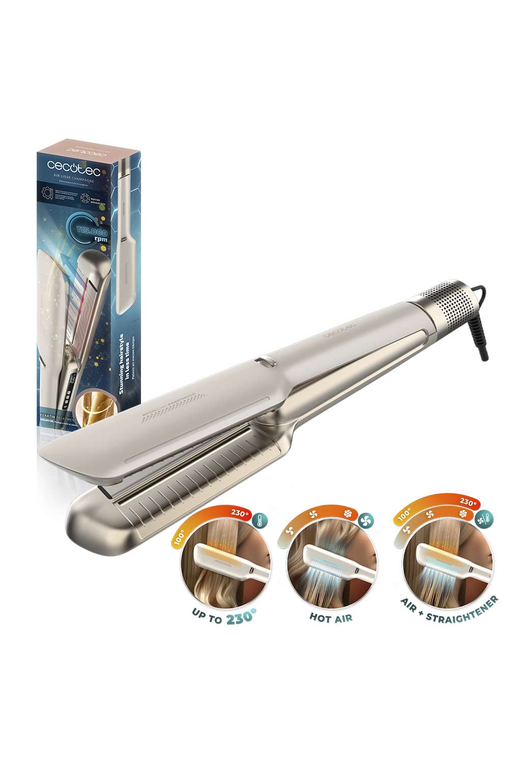 سيكوتك Air Lisse Champagne جهاز لتجفيف وتمليس الشعر بوقت واحد، مزود بمحرك BLDC، تقنية الأيونات، طلاء سيراميك وكيراتين مع زيت الأرجان، 3 أوضاع هواء، درجتي حرارة للصفائح، وشاشة مدمجة مع حساس أمان.