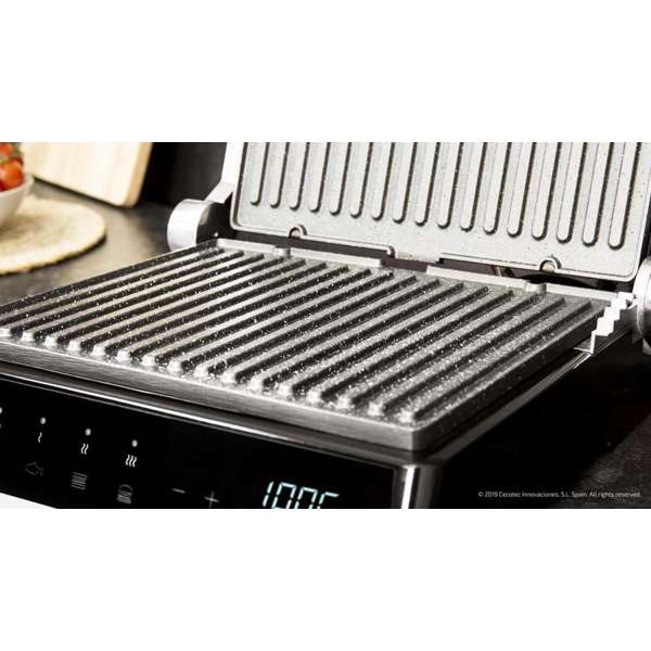 شواية كهربائية ذكية سيكوتيك Rock’NGrill Smart، بقدرة 2000 واط، نظام AutoCook، تحكم بدرجة الحرارة من 150 إلى 230 درجة مئوية، فتح 180°، صفائح قابلة للإزالة آمنة للغسل في غسالة الصحون بطلاء RockStone، شاشة LED، صينية لتجميع الدهون، سطح طهي 28.5×22.5 سم