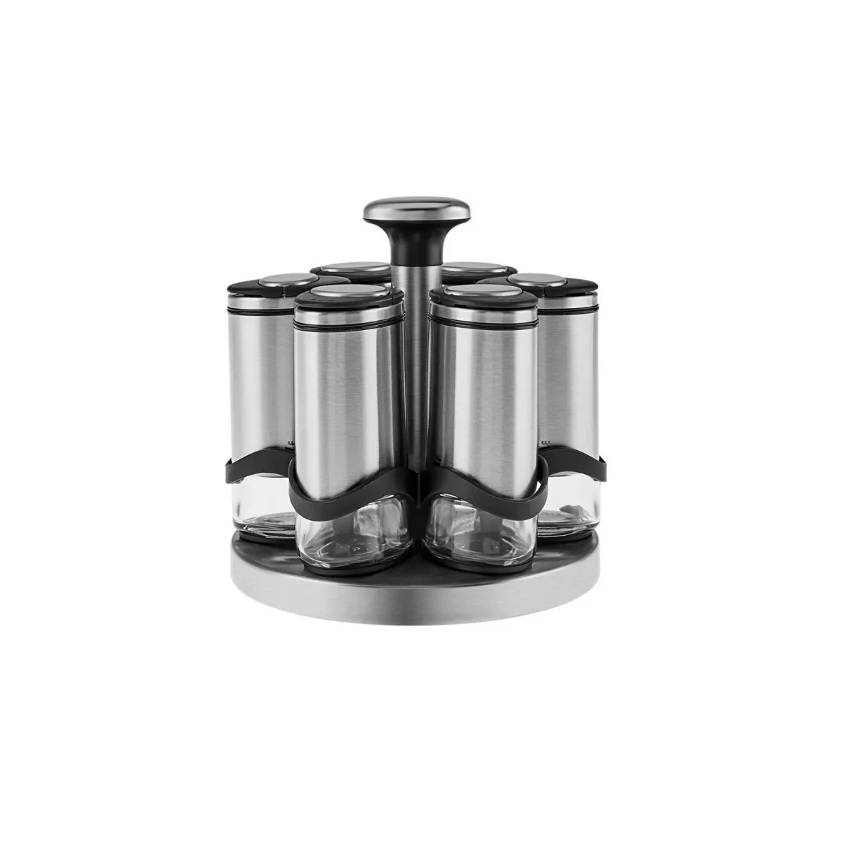 يتميز طقم بهارات من كاراجا تصميم عصري يجمع بين الزجاج الشفاف والفولاذ المقاوم للصدأ، مما يمنح المطبخ مظهرًا أنيقًا ويساعد على تنظيم التوابل بشكل مرتب وسهل الوصول أثناء الطهي