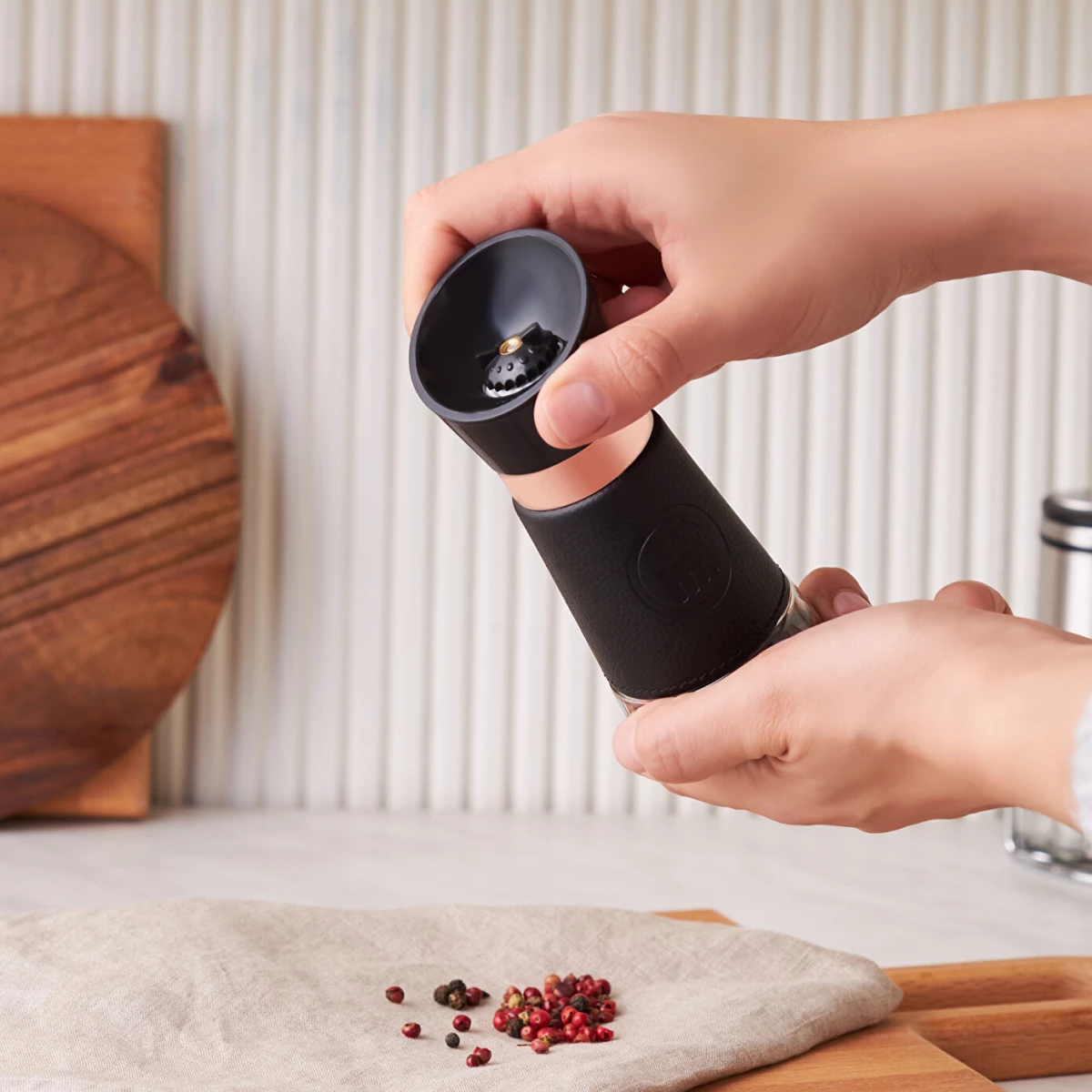 تقدّم كاراجا مطحنة توابل عملية وفاخرة تجمع بين الأداء الممتاز والتصميم العصري. بسطح خارجي أنيق من الجلد الأسود ومتانة عالية، تسمح لك هذه المطحنة بطحن التوابل والفلفل بسهولة لتحصيل نكهات طازجة تضيف لمسة مميزة لأطباقك في كل مرة.